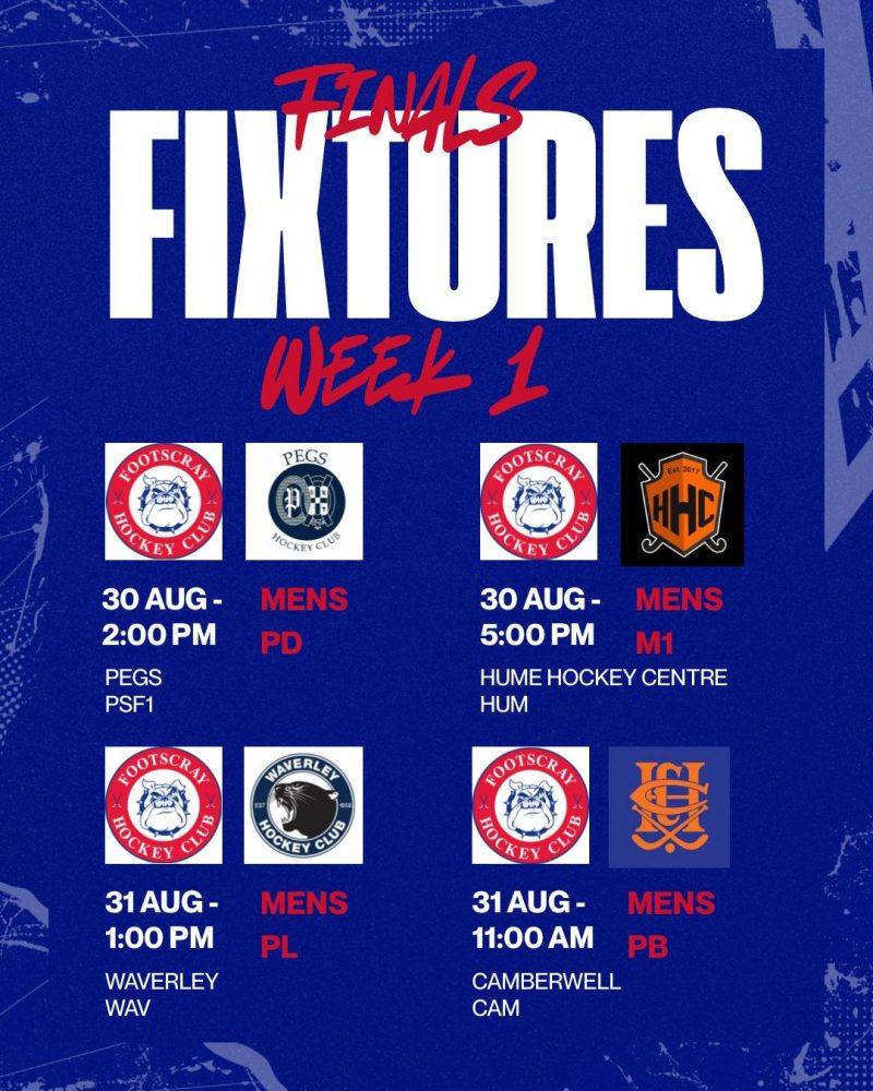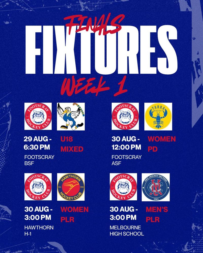WEEK 1 FINAL FIXTURES Aug 29, 2025 It’s finals hockey time! Congratulations to the junior and seniors teams teams that have qualified! It all kicks off tonight. Check out the fixtures, grab your red, white and blue, and get on down and show your support! Let’s go doggies!! #fhc #footscrayhockey #fhcjuniors #hockeyvictoria #hvpremierleague